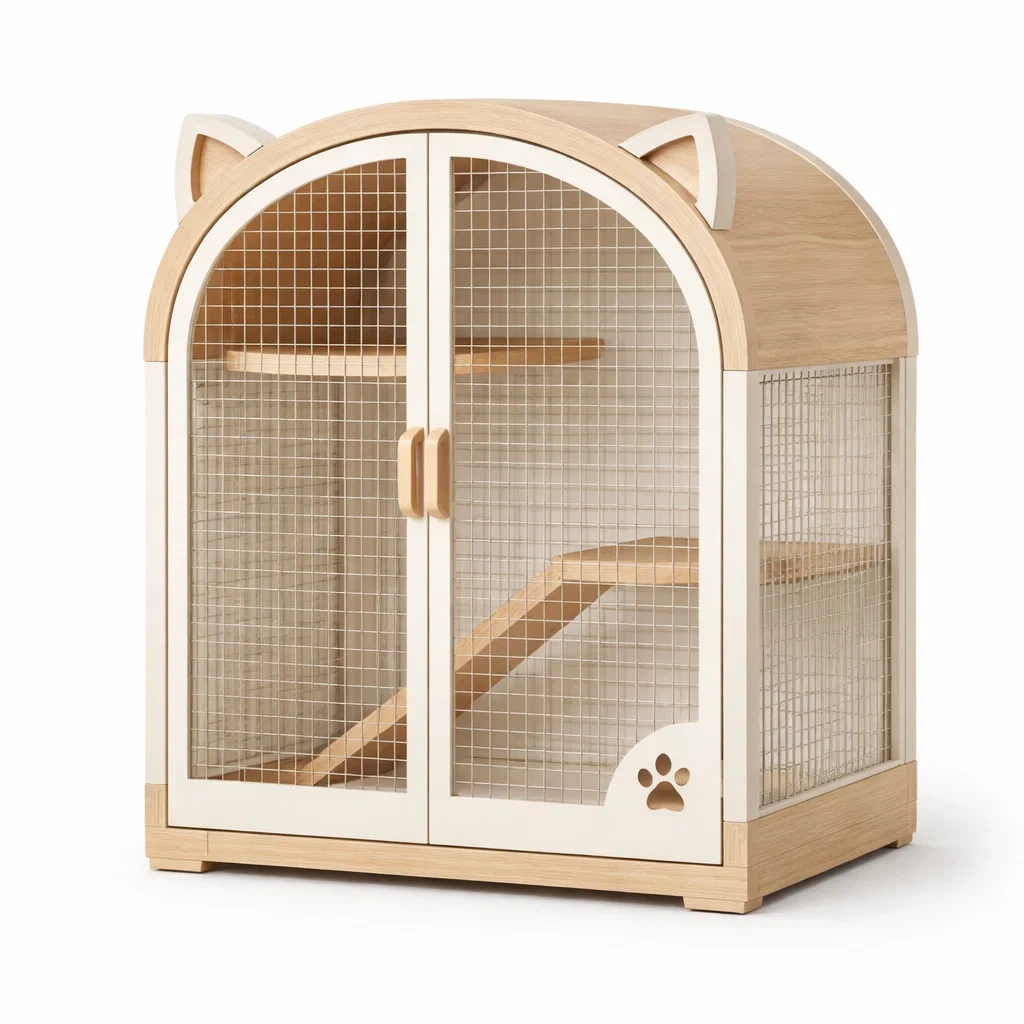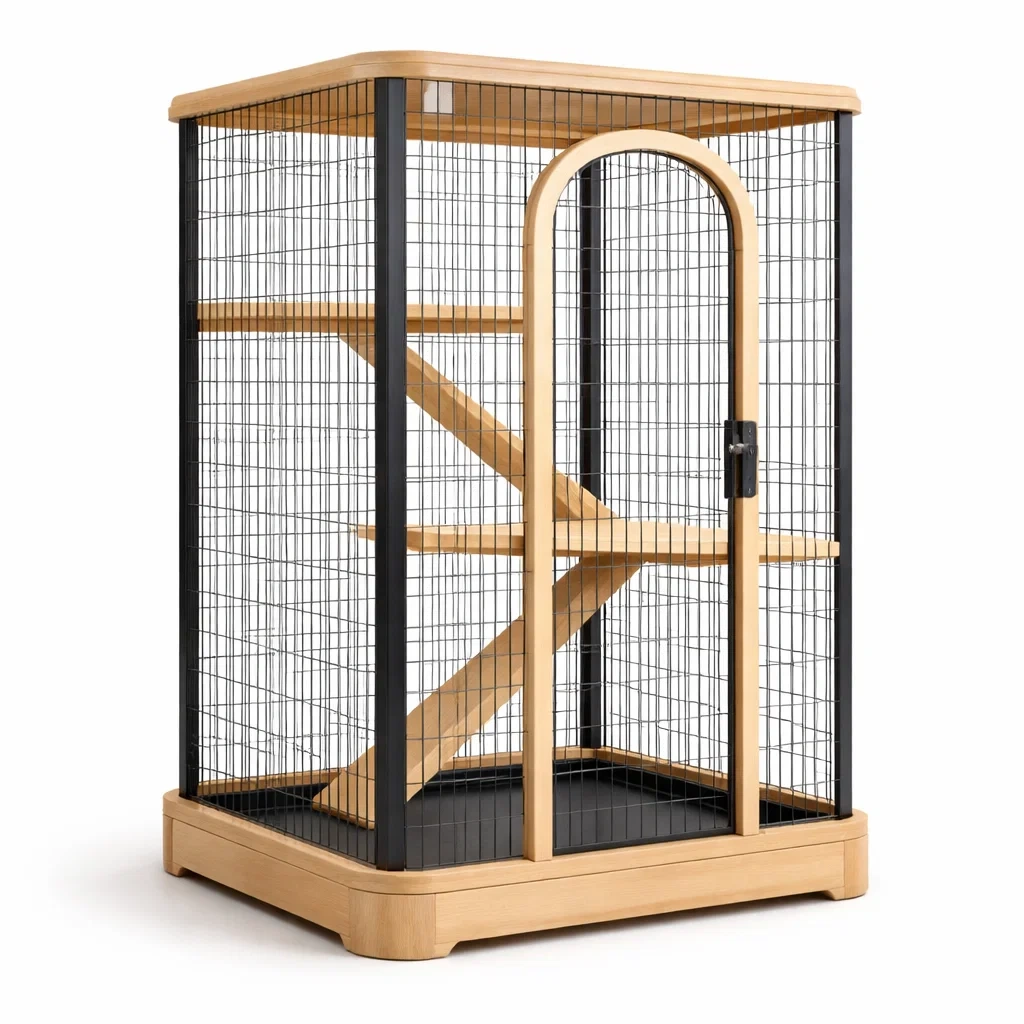 Gabbia per gatti in legno e metallo con struttura alta a tre livelli