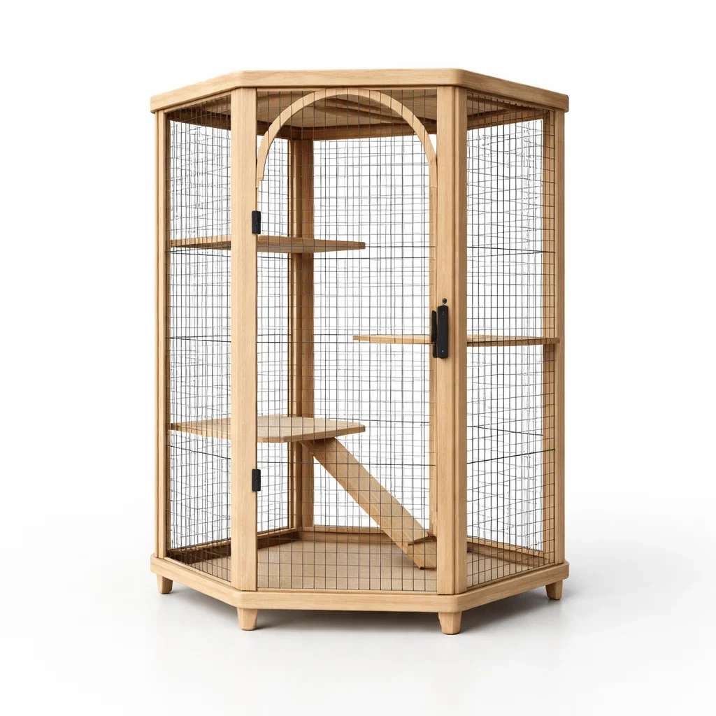Gabbia per gatti in legno e metallo con struttura esagonale