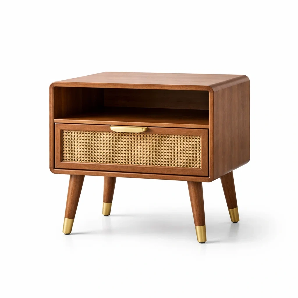 Questo comodino è realizzato in legno di noce con un cassetto in rattan. Presenta un cassetto e un vano aperto per lo stoccaggio. Le dimensioni sono: altezza 55 cm, larghezza 45 cm, profondità 35 cm. Il peso totale è di 8.50 kg.